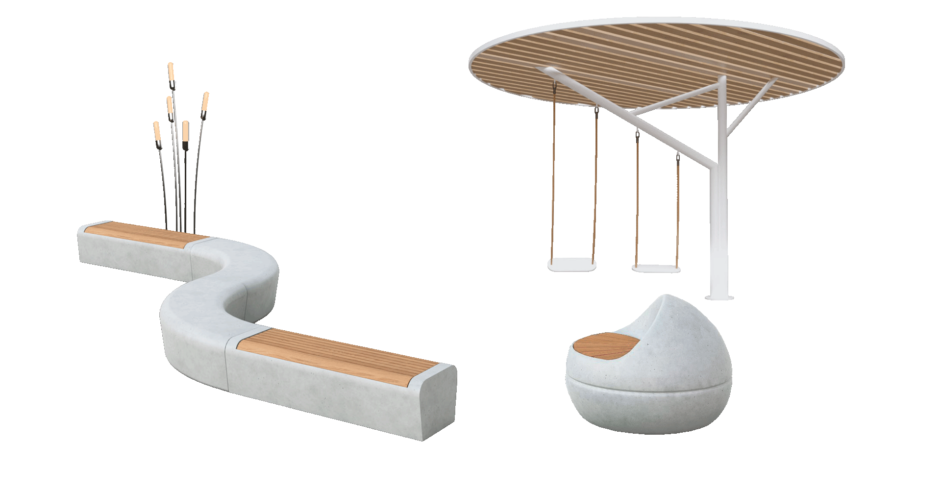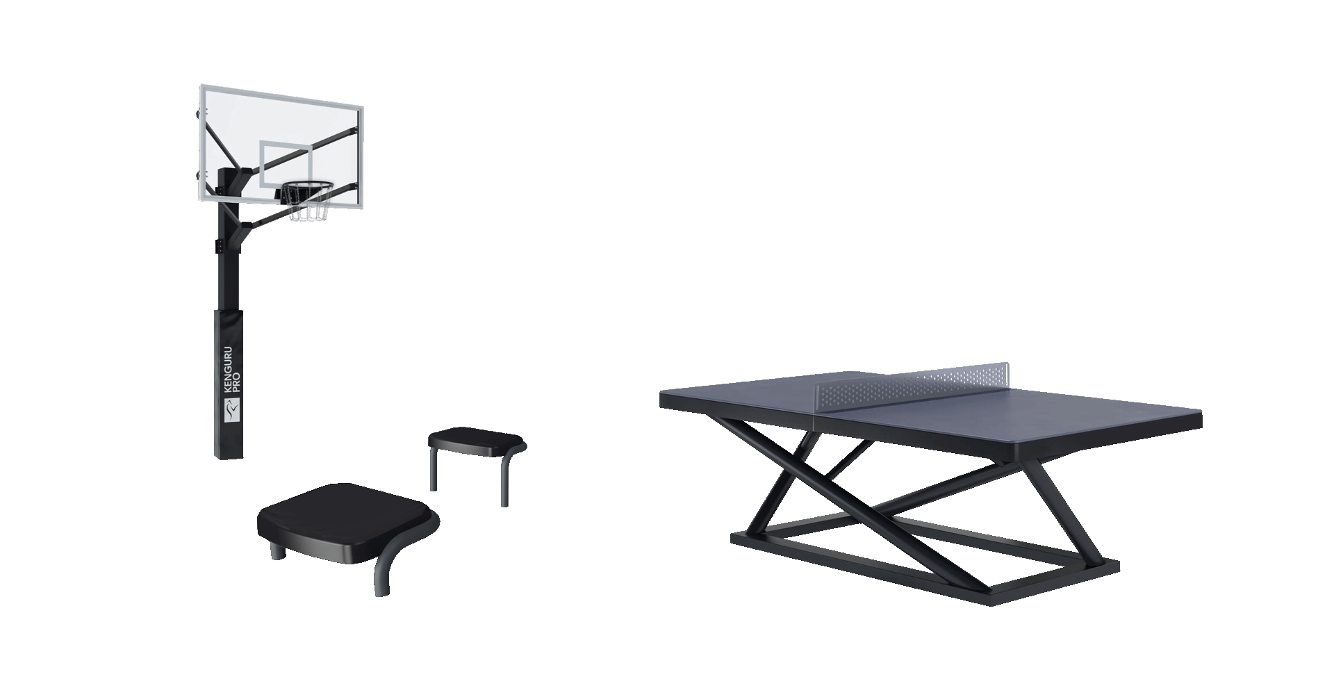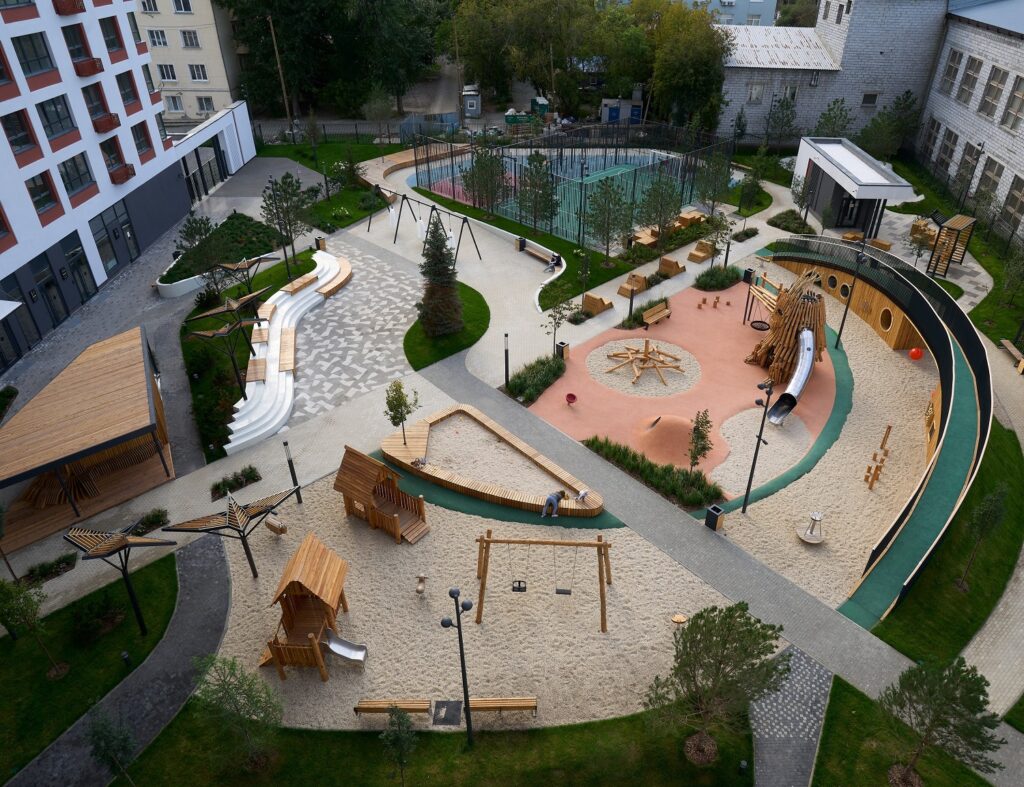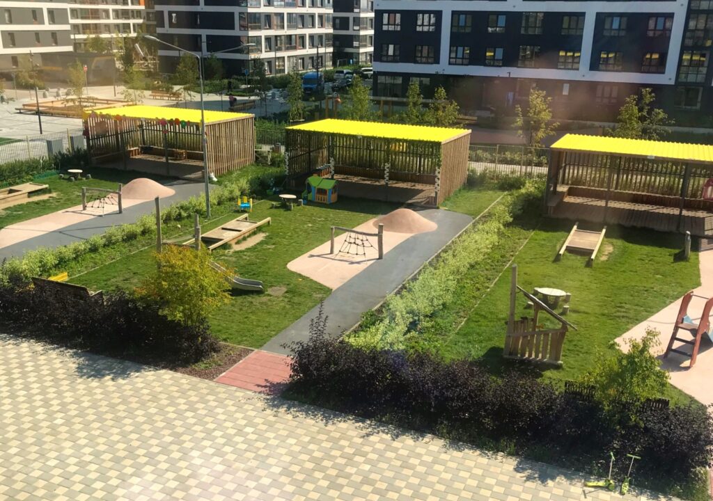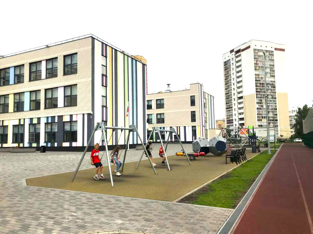 При проектировании учли, что не все любят заниматься спортом у всех на виду – спортивная площадка находится за кортом. Световые качели пользуются большой популярностью, к ним каждый вечер очередь из подростков. Карусели, чаши, прутики — популярны у детей. За год эксплуатации оборудование не сломалось.
