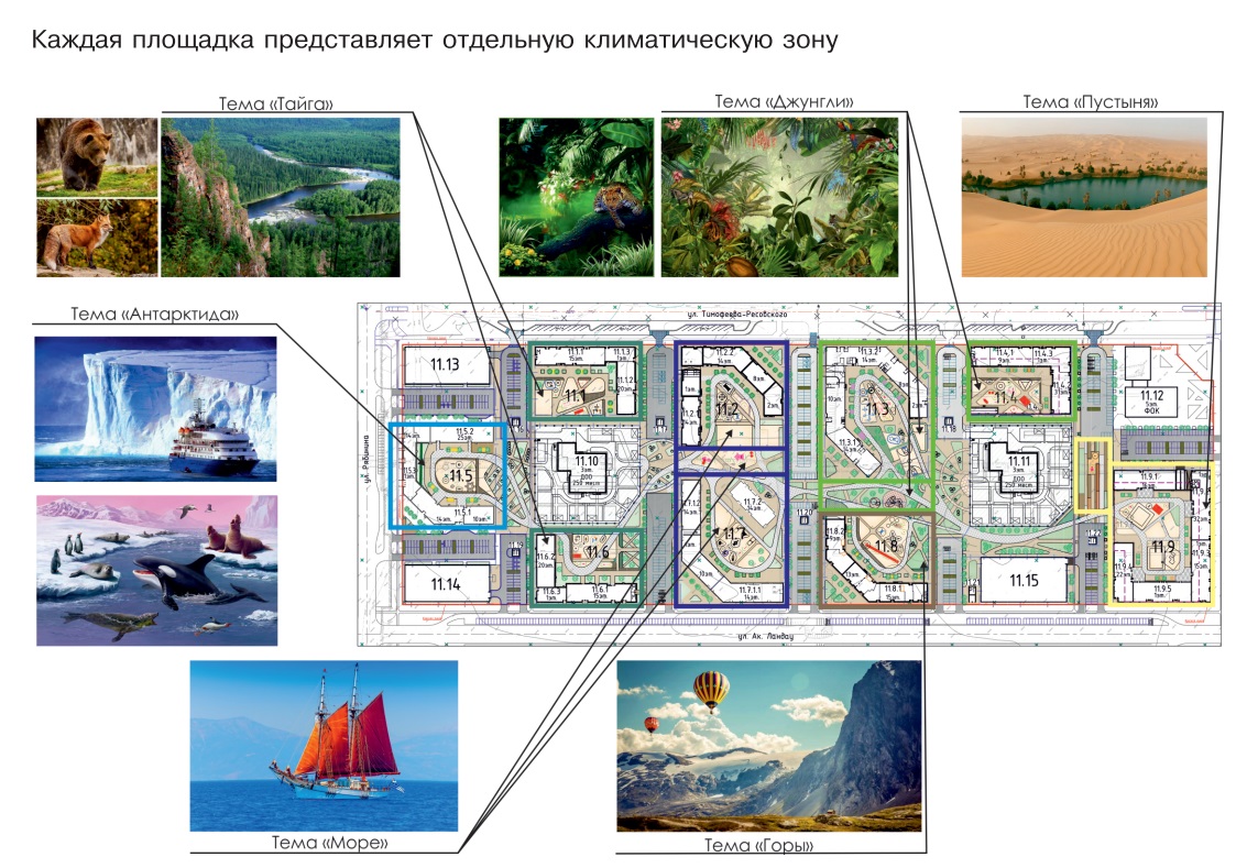 Гуляя по ЖК Eleven можно побывать: в Антарктиде, Тайге, Джунглях, Горах, Пустыне, на Море.