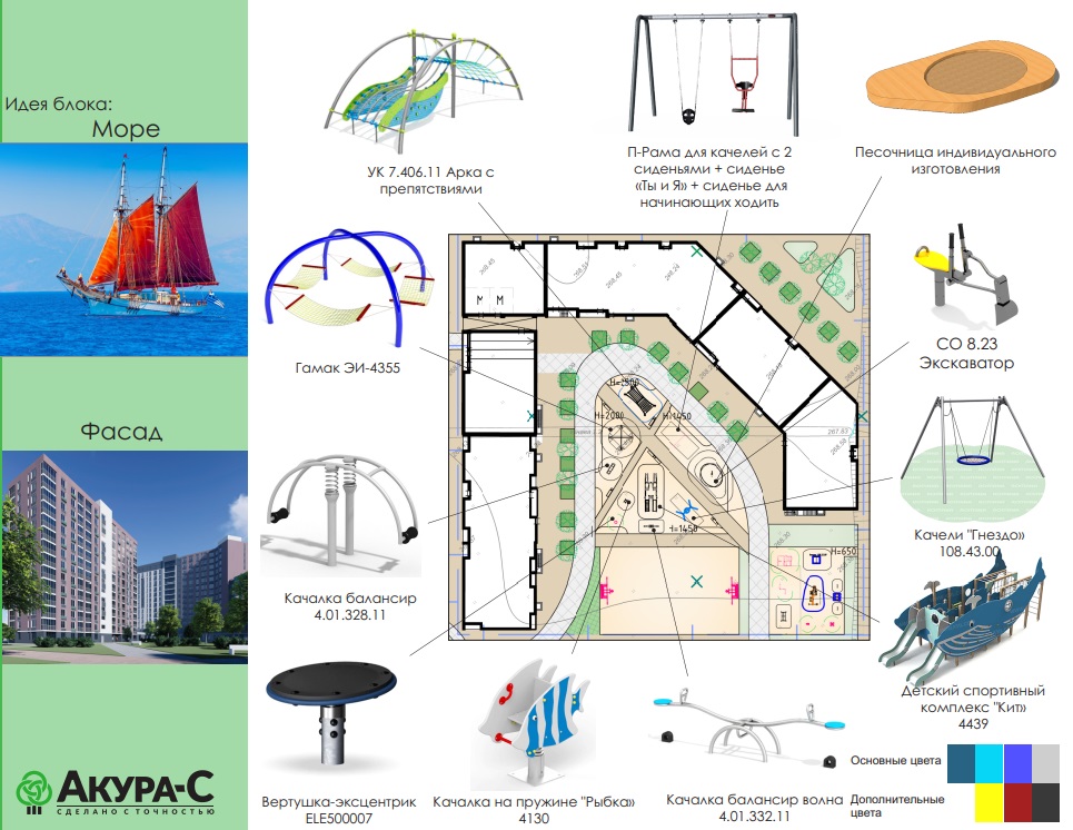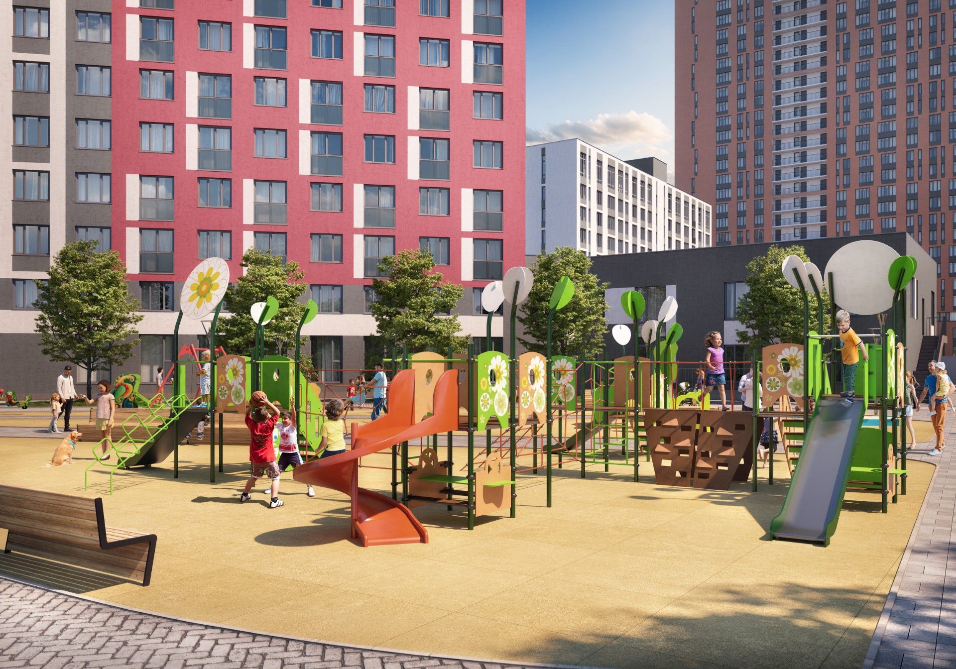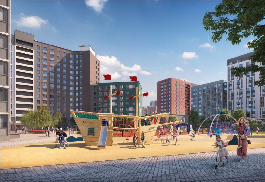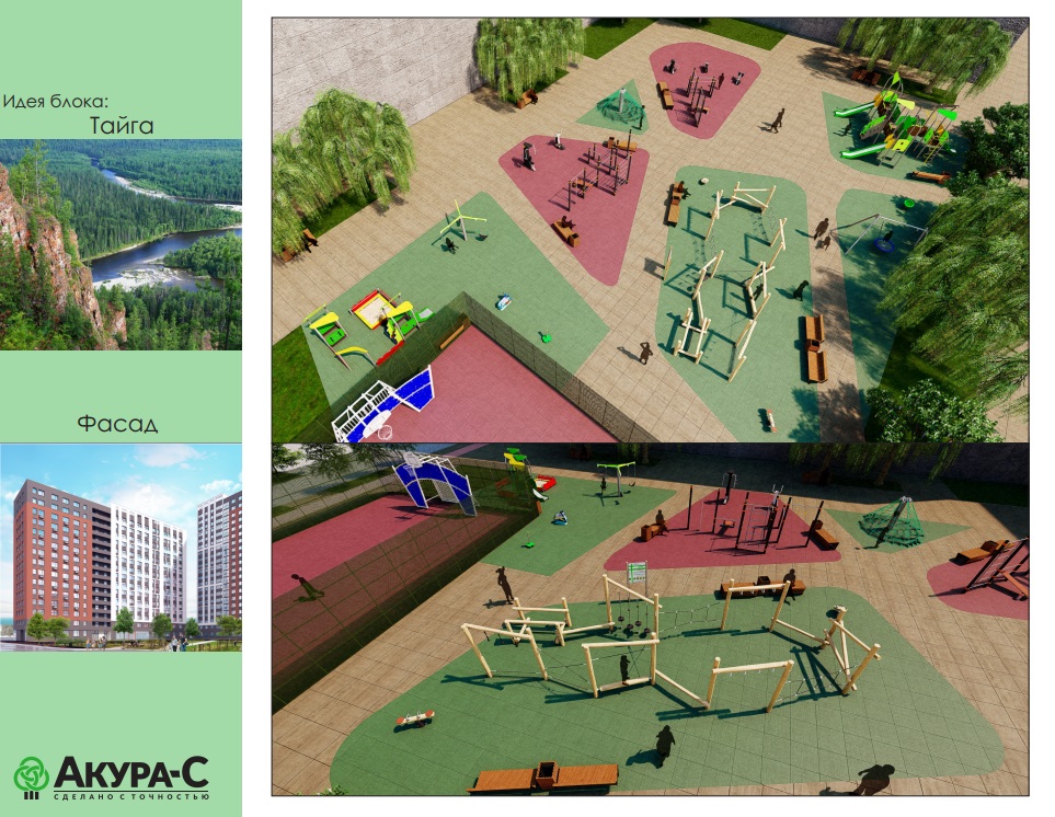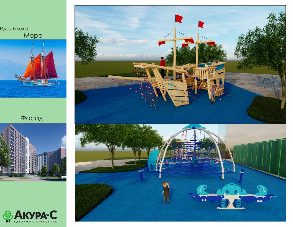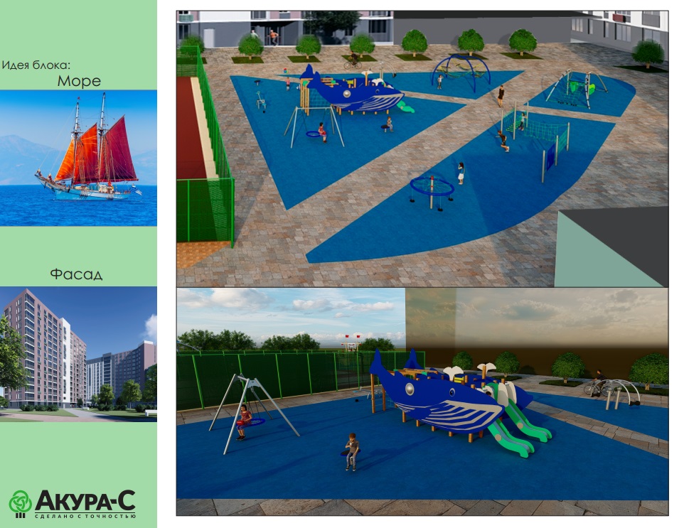 Тема дворов поддерживается игровым оборудованием, акцентными комплексами от российских и европейских производителей, покрытиями.
