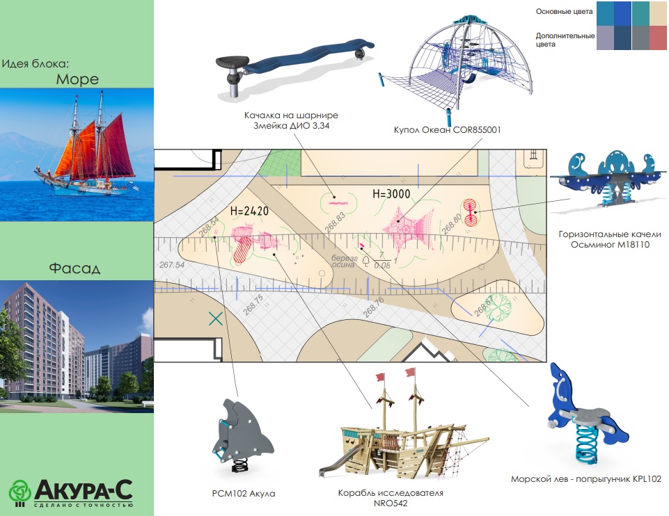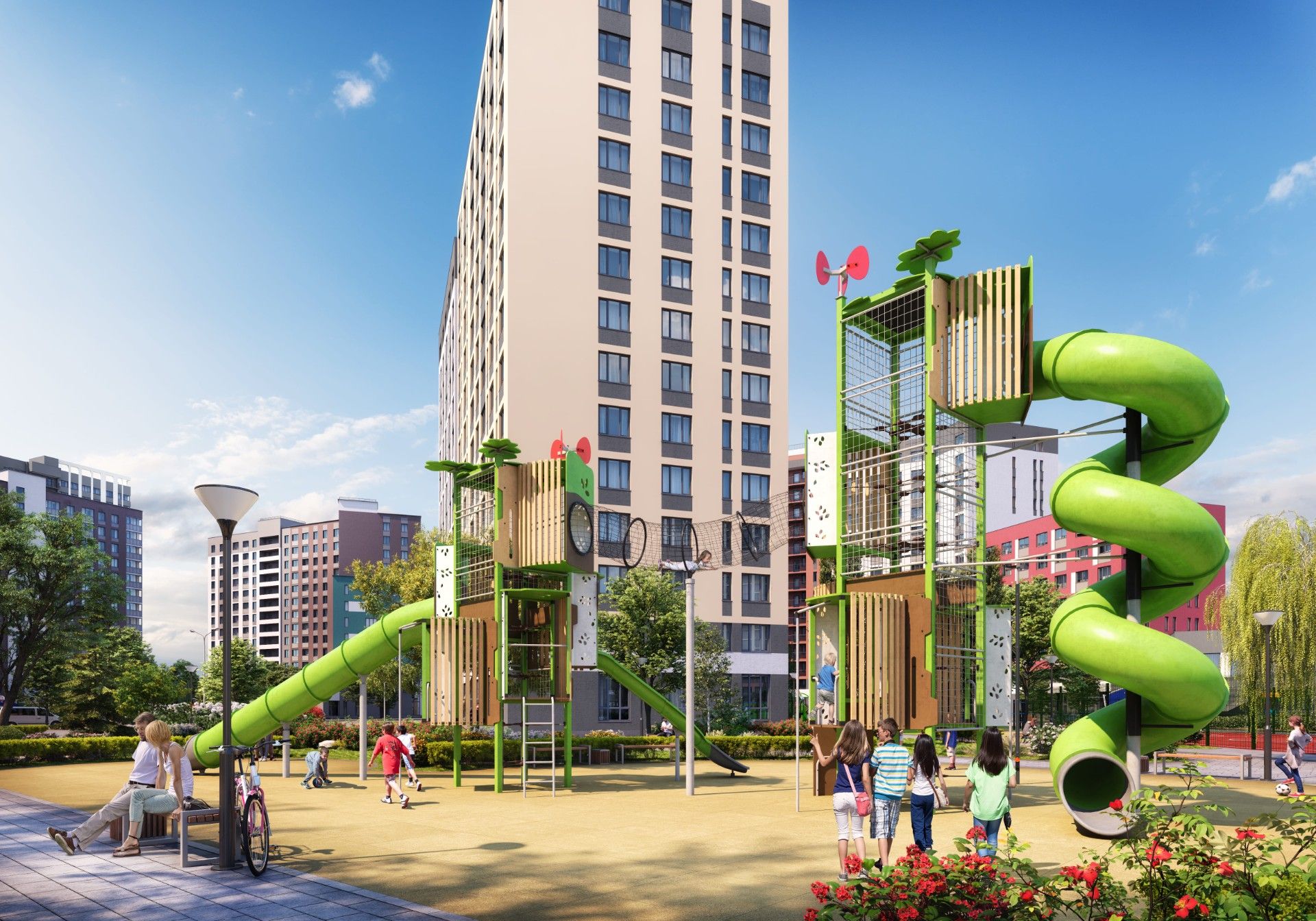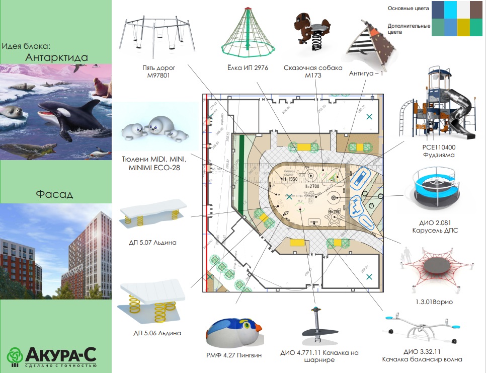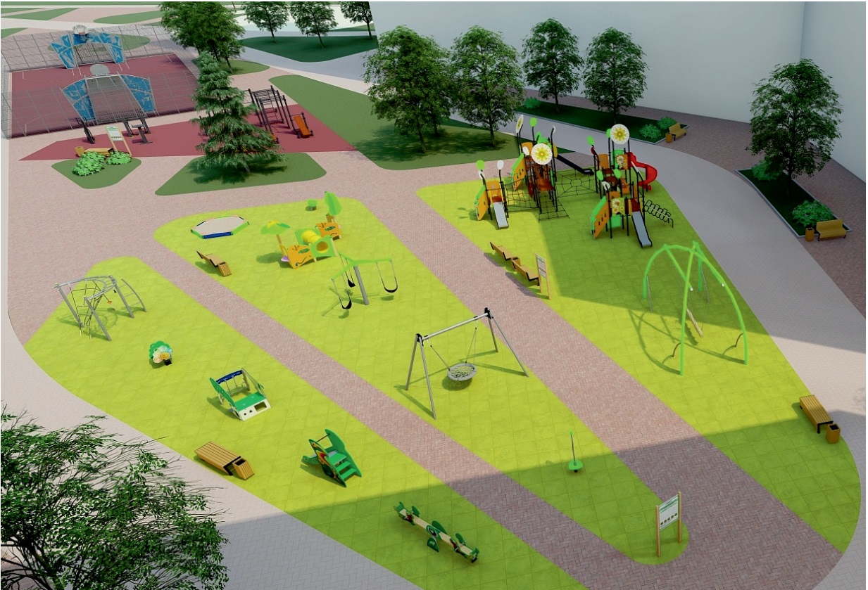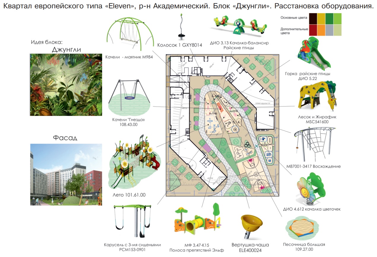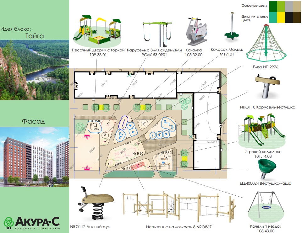 Тема дворов поддерживается игровым оборудованием, акцентными комплексами от российских и европейских производителей, покрытиями.
