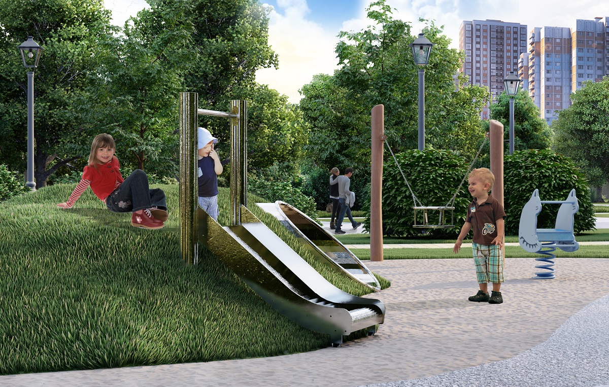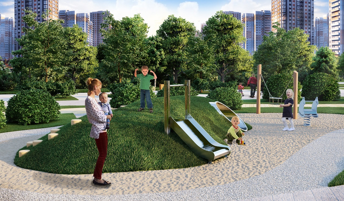 Детская площадка с небольшим количеством игрового оборудования и геопластикой — универсальный вариант качественной детской площадки с ограниченным бюджетом.