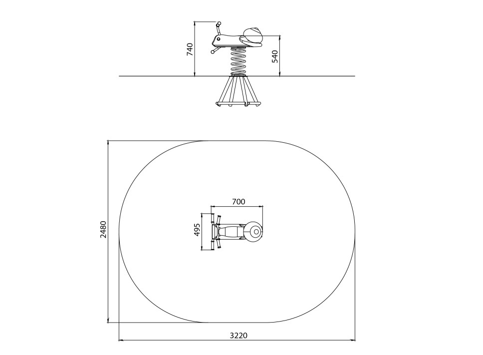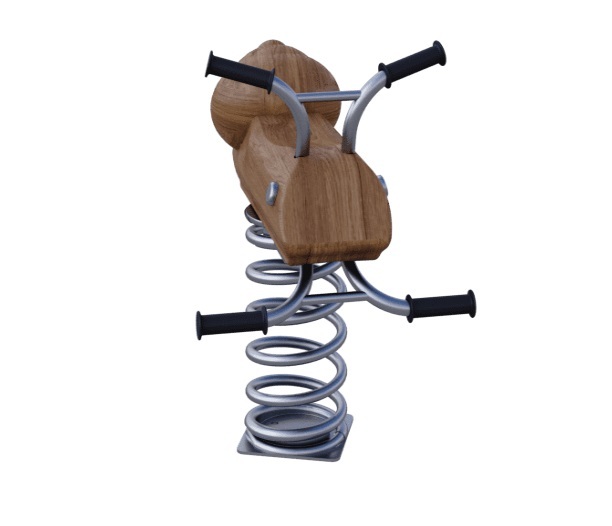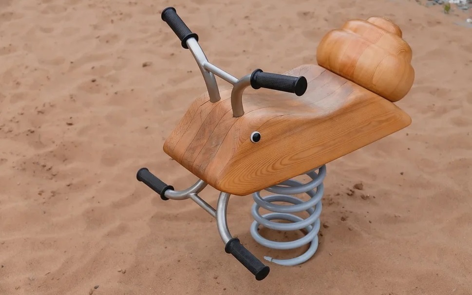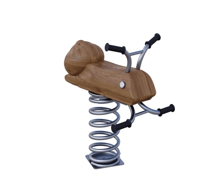 Качалка выполнена в виде улитки с ручками и подножками, раскачивающейся на пружине. Ручки и подножки выполнены из нержавеющей стали. Улитка изготовлена из тщательно отшлифованной древесины высочайшей прочности с масляной пропиткой снаружи.