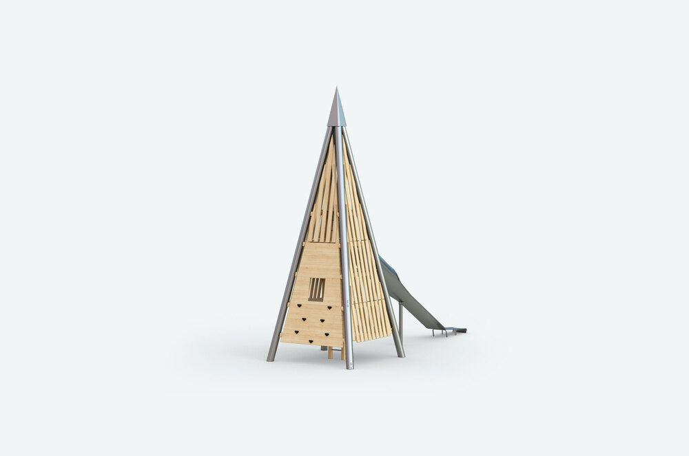 Башня в форме четырёхгранной пирамиды будет интересно смотреться на любой детской площадке. Оборудована лестницей для подъёма на стартовую площадку, а также металлической трубой-горкой для спуска.