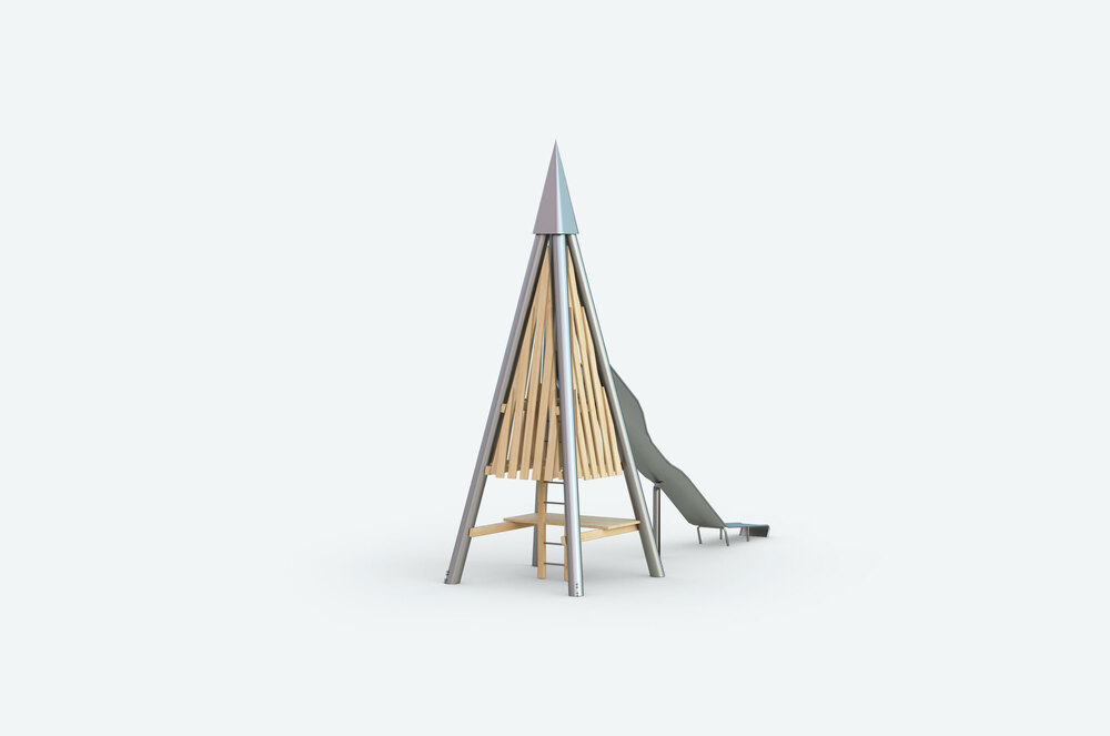 Башня в форме четырёхгранной пирамиды будет интересно смотреться на любой детской площадке. Оборудована лестницей для подъёма на стартовую площадку, а также металлической горкой для спуска.