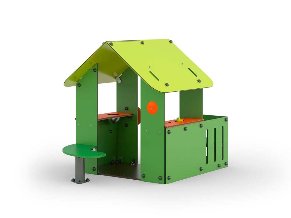Игровой комплекс в виде домика в ярких зелёных цветах. Будет интересен для самых маленьких на детской площадке. Оборудован двумя столиками и двумя небольшими скамейками для отдыха.