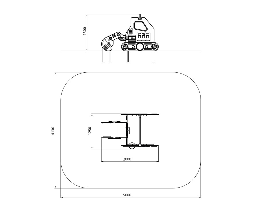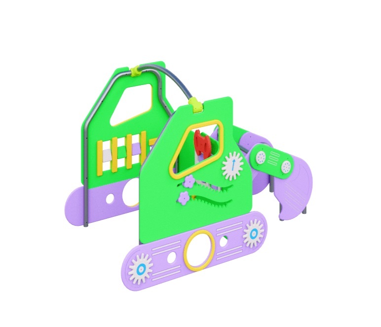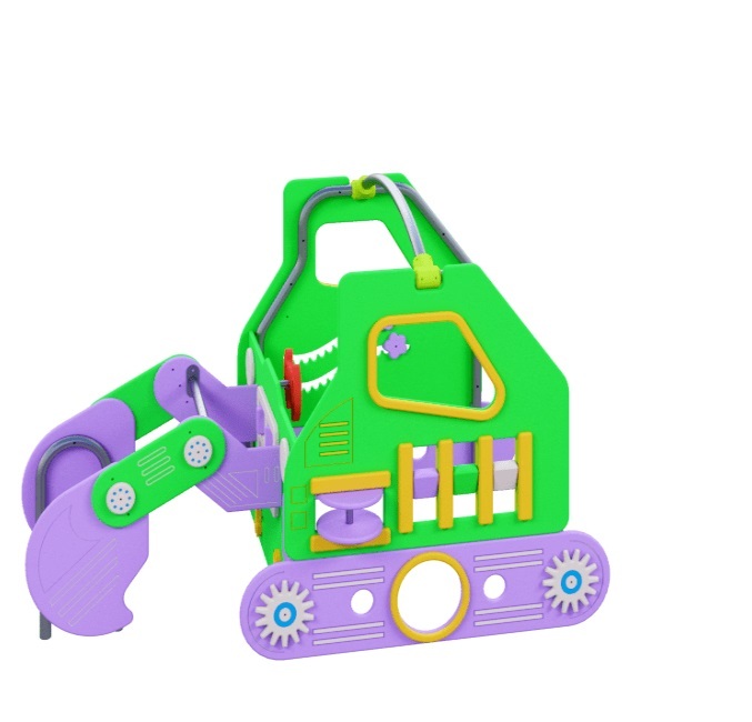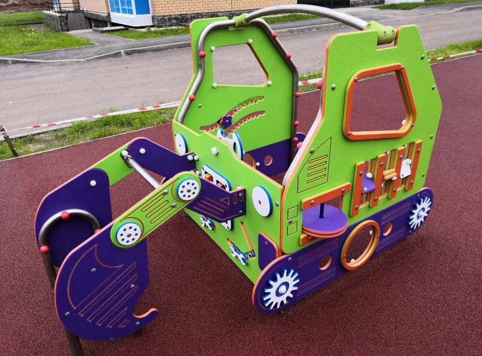 Комплекс состоит из металлических элементов и ограждений в виде деталей экскаватора. Металлические элементы изготовлены нержавеющей стали. Ограждения выполнены из HPL пластика.