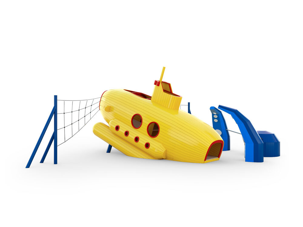 Интересный игровой комплекс для детей разных возрастов. Изготовлен в виде плавательного аппарата. Внутри находится подъем в виде сетки на «cмотровую площадку». На ней, в носовой части батискафа расположена обзорная труба, а также стол/платформа и посадочные места для участников игры.