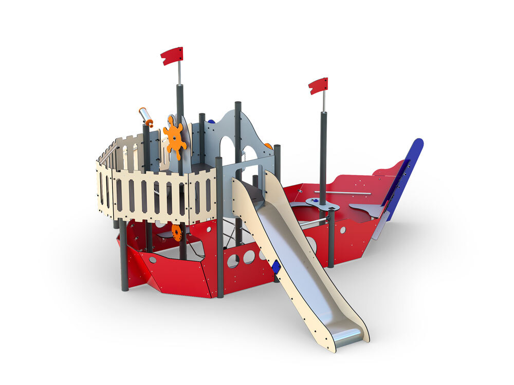 Функциональная игровой комплекс. Конструкция оборудована яркими тематическими деталями и спортивными элементами для двигательной активности: лестница для поднятия, канатная сетка и качели в оригинальном исполнении. Каждому юному гостю этого корабля, будет отведена роль в незабываемом морском путешествии.
