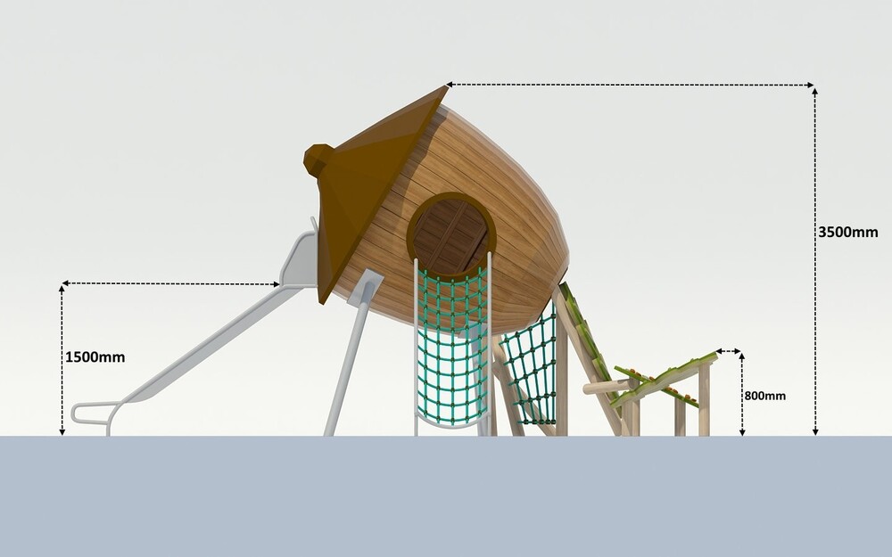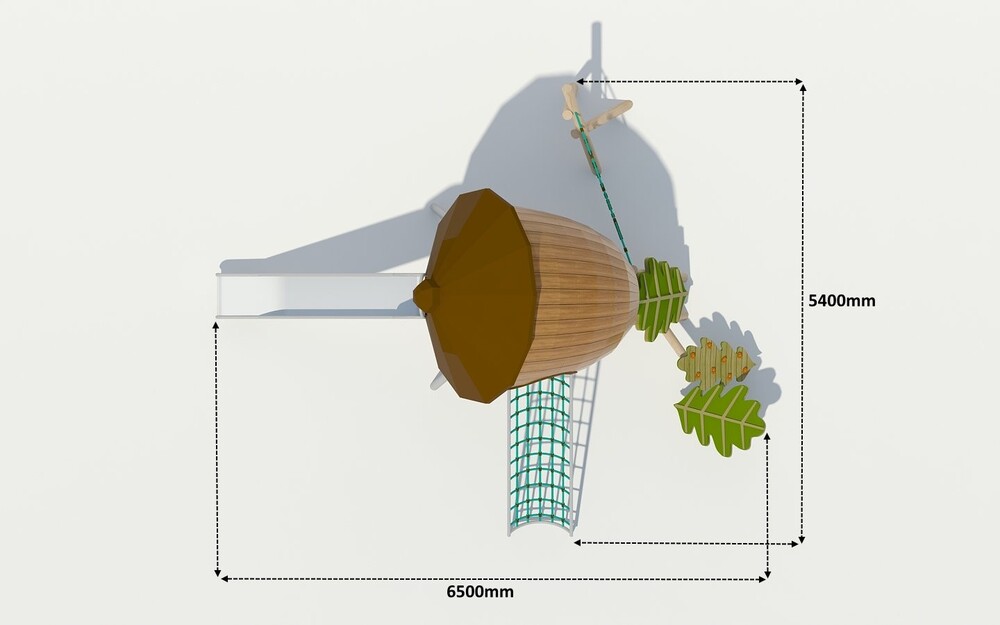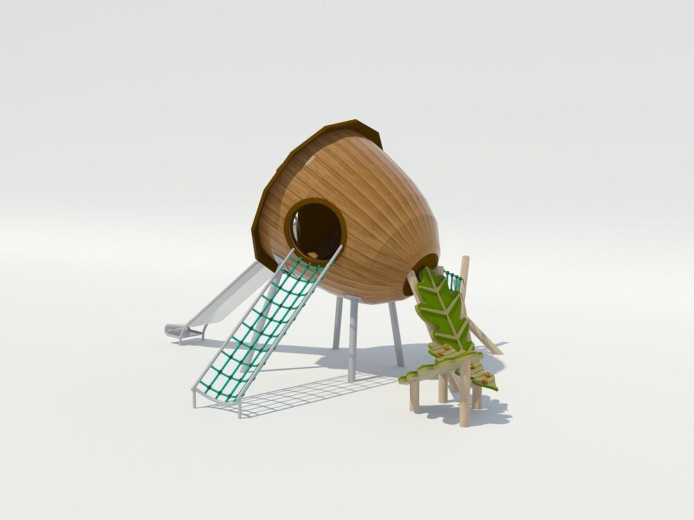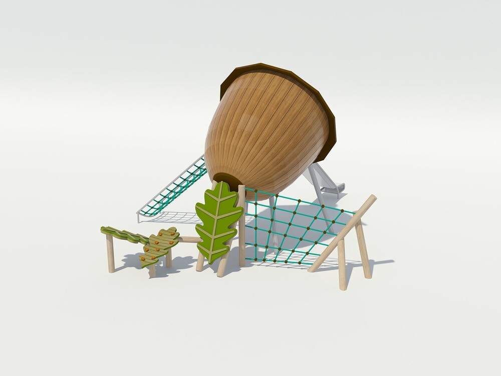 На детской площадке располагаются сразу несколько элементов: сам желудь, лесенка из винтового каната и лазалки в форме листьев. Забраться внутрь желудя можно по канатной лестнице, окошко входа закрывается при помощи дверцы.