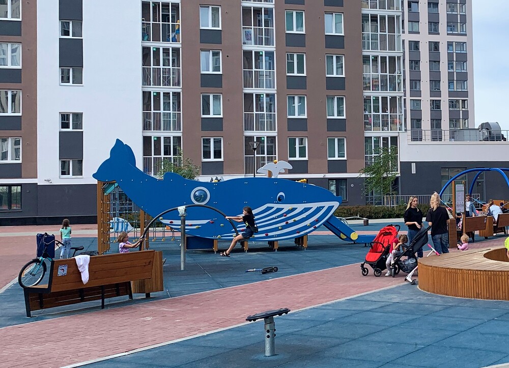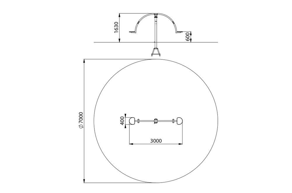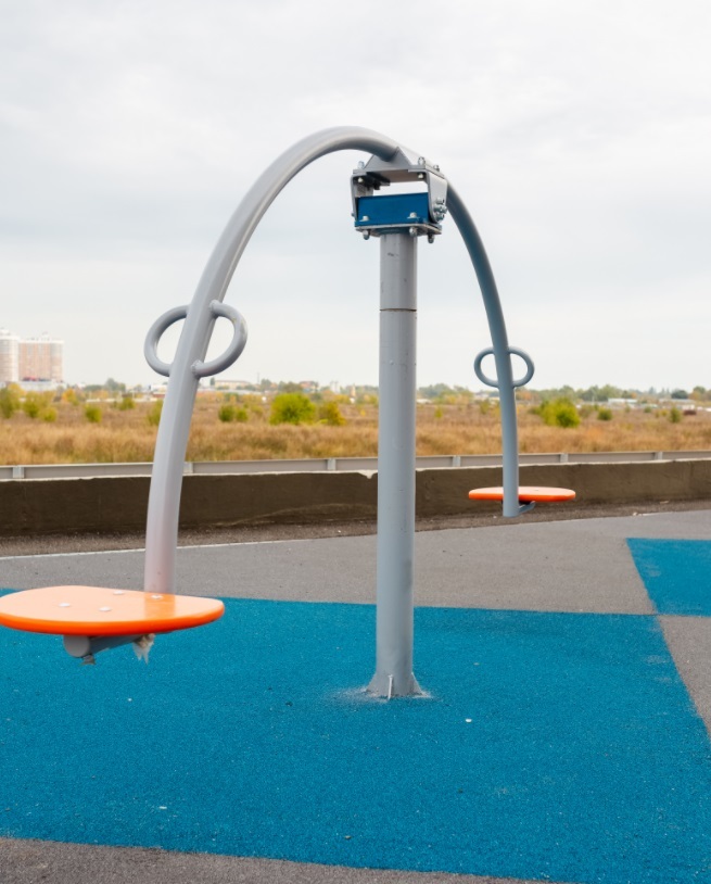 Качалка-карусель состоит из металлического дугообразного коромысла с сидениями по краям и центральной несущей стойки.