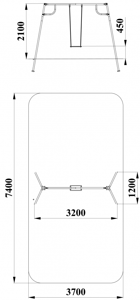 Качель сомтоит из четырех металлических опор иметаллической перекладины под один подвес.