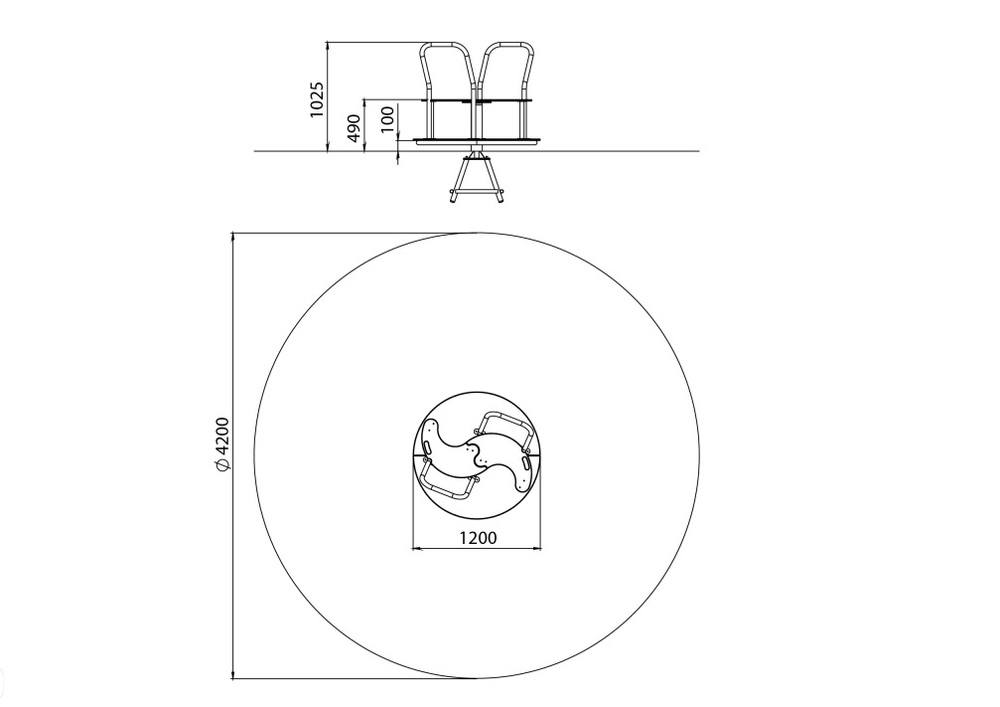 Карусель состоит из металлического каркаса, окрашенного порошковой полимерной краской, поручней из нержевеющей стали, сидений из HPL пластика и пола из экструдированного высокомолекулярного полиэтилена.