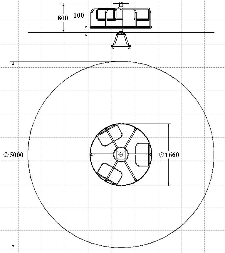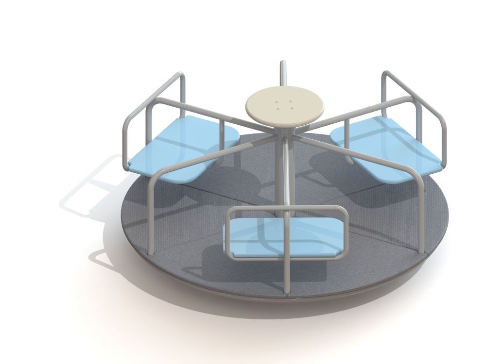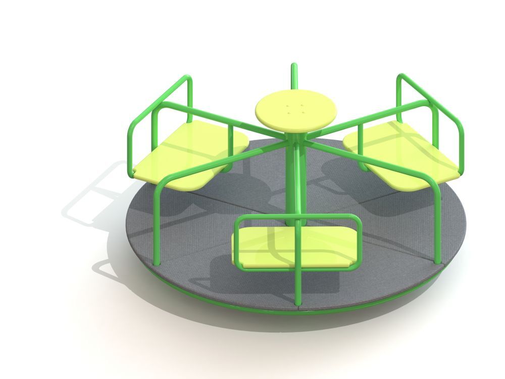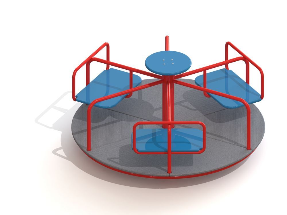 Карусель изготовлена из металлического каркаса с фанерным рулем, шести фанерных сидений и пола из влагостойкой ламинированной фанеры.