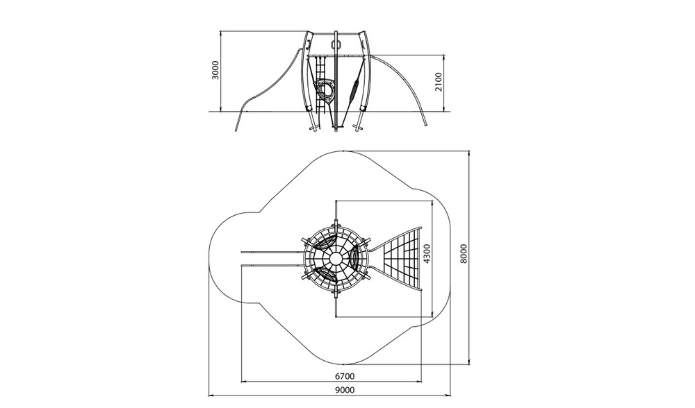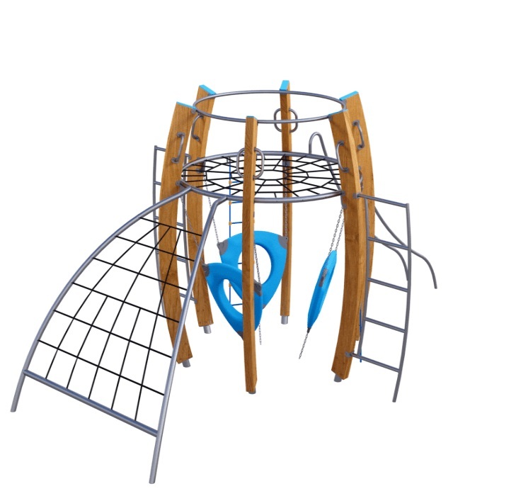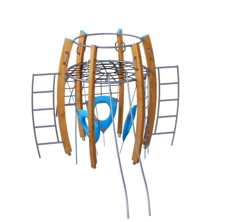 Универсальный комплекс состоит из гимнастического оборудования и шести изогнутых деревянных стоек. Между деревянных стоек крепится круглая сетка и пластиковые лазы с отверстиями. Все металлические гимнастические элементы выполнены из стали с оцинкованным покрытием. Оцинковка металла производится методом электрохимической гальванизации. Деревянные стойки выполнены из тщательно отшлифованной древесины высочайшей прочности и окрашены высококачественным лаковым покрытием. Лазы с отверстиями выполнены из высококачественного пластика. Сетки изготовлены из многожильного армированного износостойкого каната.