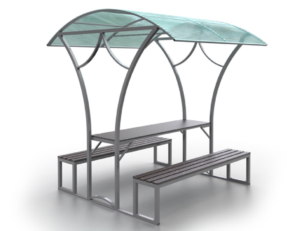 Беседка «Летняя» представляет собой металлическую разборную конструкцию, состоящую из 2-х опорных элементов, 2-х скамеек, столешницы и крыши.