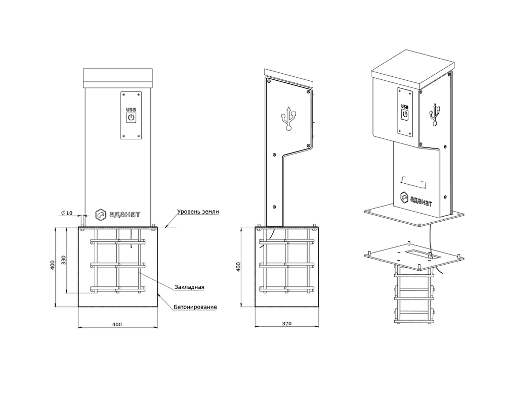 Конструкция из металла и пиломатериалов хвойных пород древесины, имеет 1 usb-выход для зарядки любых мобильных устройств, оснащена деревянным настилом для сидения. Для подключения изделия к сети требуется коммутация выводного кабеля зарядной станции с линией электроснабжения 220 вольт. Вводное напряжение — 220 В переменного тока, Потребляемая мощность при рабочем цикле max — 30 Вт, Точка ввода снизу изделия.
